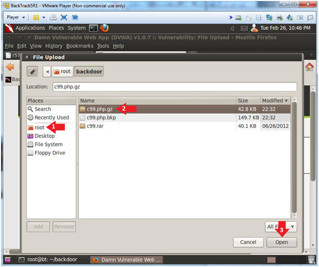 - Click the Browse button and navigate to /root/backdoor/c99.php.gz
